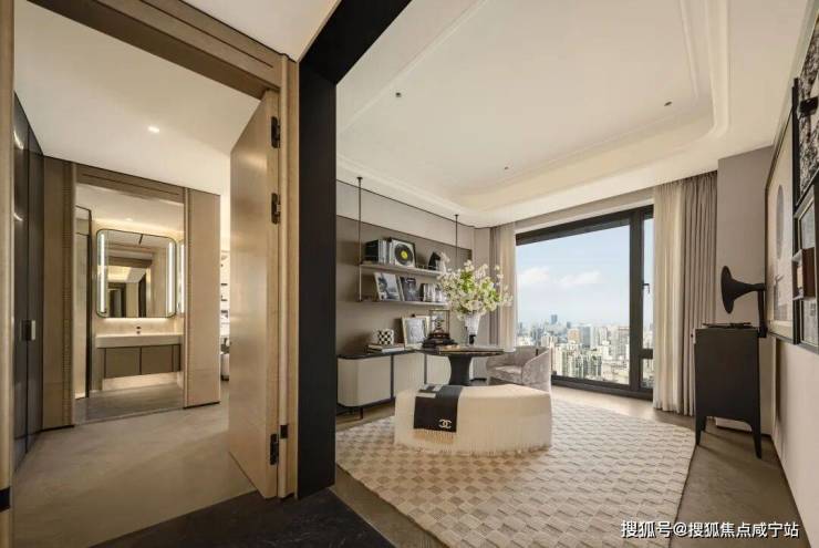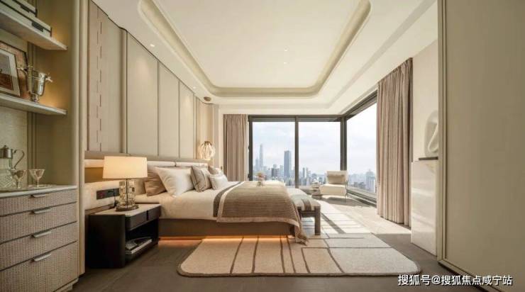 三套房设计,主卧以酒店式套房的格局,搭配270°环幕视野,让每一天的醒来都有光影作陪;