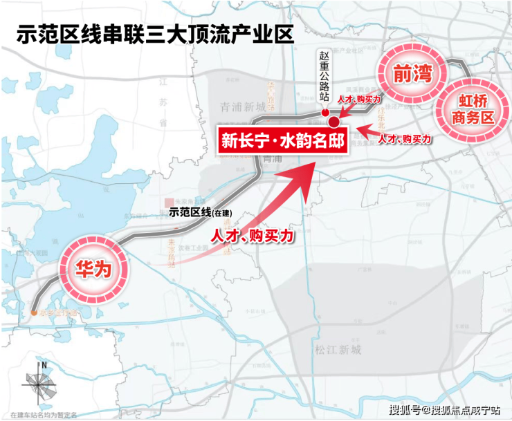 示范区线(在建)西连长三角、华为研发中心,东接大虹桥。从赵重公路站出发,3站虹桥枢纽。