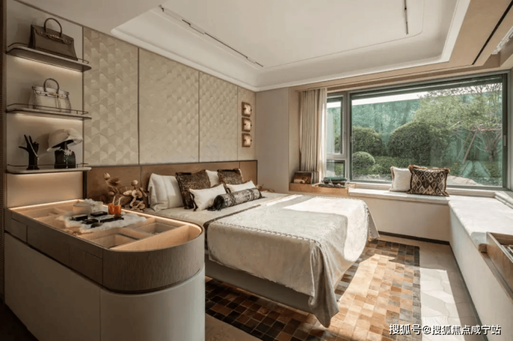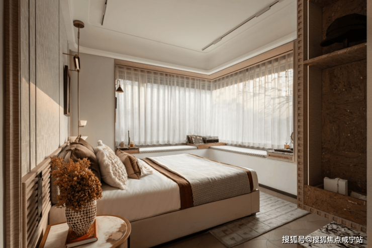 l270°无柱飘窗的主卧套设计,打造出一座“空中观景舱”,将晨昏光影、四季流转尽数收纳,极大拓展了生活的视觉与心理边界,推窗即览美景,让居家时光更具诗意。