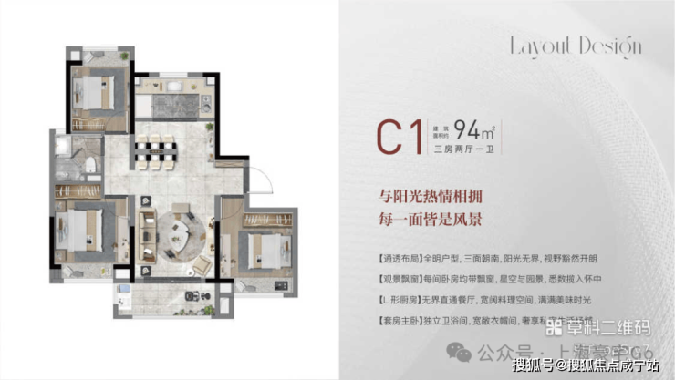 建面约94㎡三房:南向三面宽、U型厨房+双卫配置,三代同堂无忧;