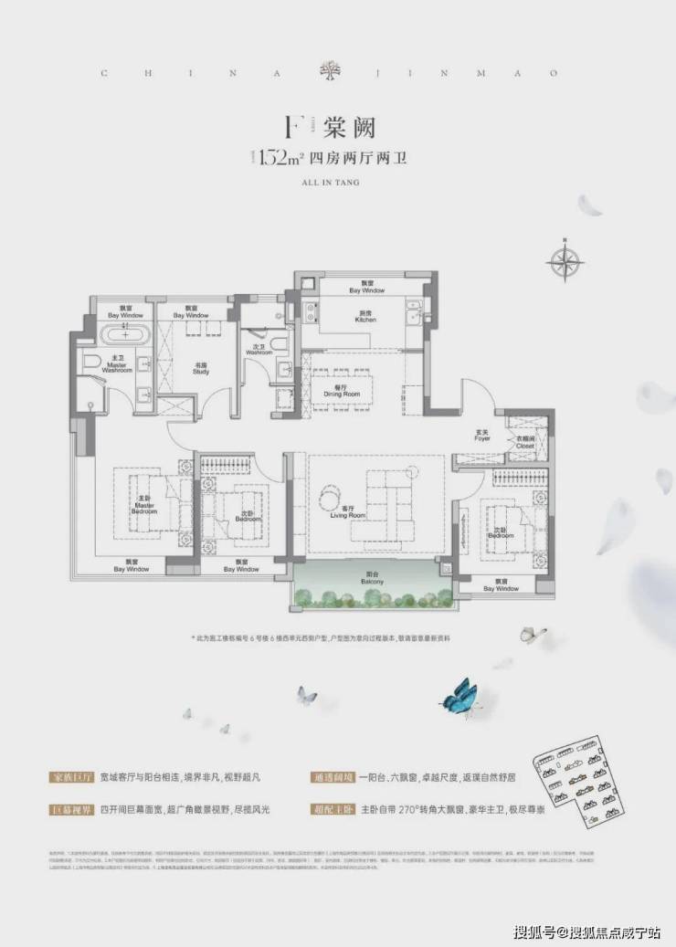三开间朝南+5个飘窗+主卧套房设计+270°转角飘窗,较105㎡来说,居住体验、舒适度、尺度感更大!
