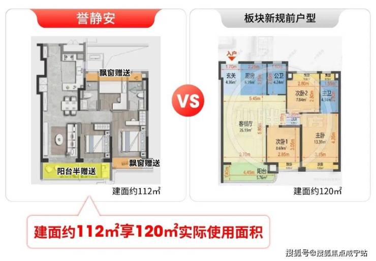 项目最核心的优势,就是超高实得率。据小胖君测算:建面约112㎡户型,实际使用面积堪比新规前120㎡。