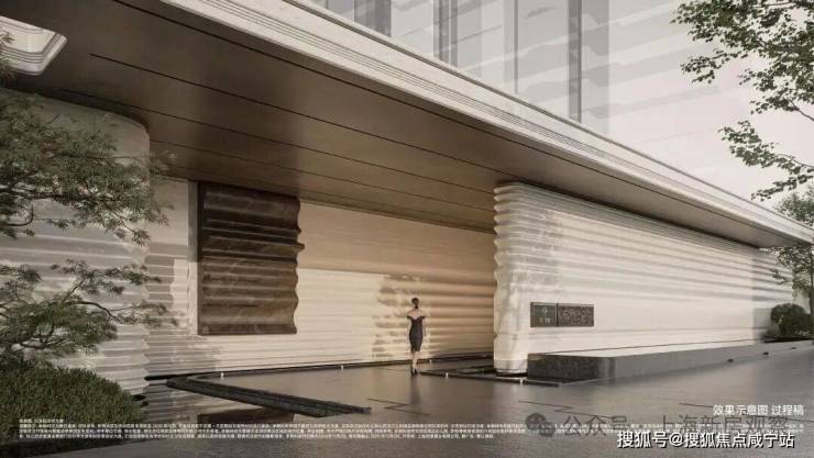 建筑立面上,项目萃取希腊柱式秩序感,以古铜色铝板、超大玻璃幕墙与灵动弧线的高端组合,窗墙比最大达0.35,呈现出温润典雅的质感。同时,秉持“揉石成缎”的审美理念,以温润隽永的弧度造型呼应海派河流意向,打造项目温润雅奢的气质美学,呼应在文化下长成的高端客群。