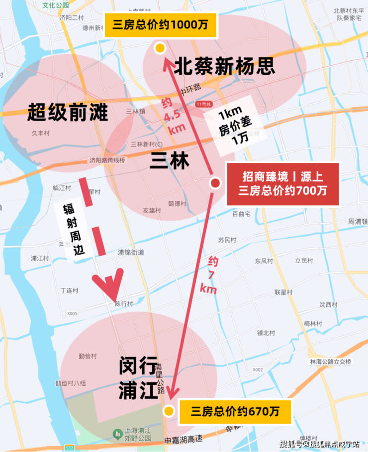而招商臻境建面约105㎡三房主力总价约700万级,部分房源总价约650万级,相比之下,北面直线距离约4.5km的北蔡新杨思,板块在售新房单价陆续超10万+/㎡,想买三房预算需破千万,每隔1km房价就几乎相差1万。