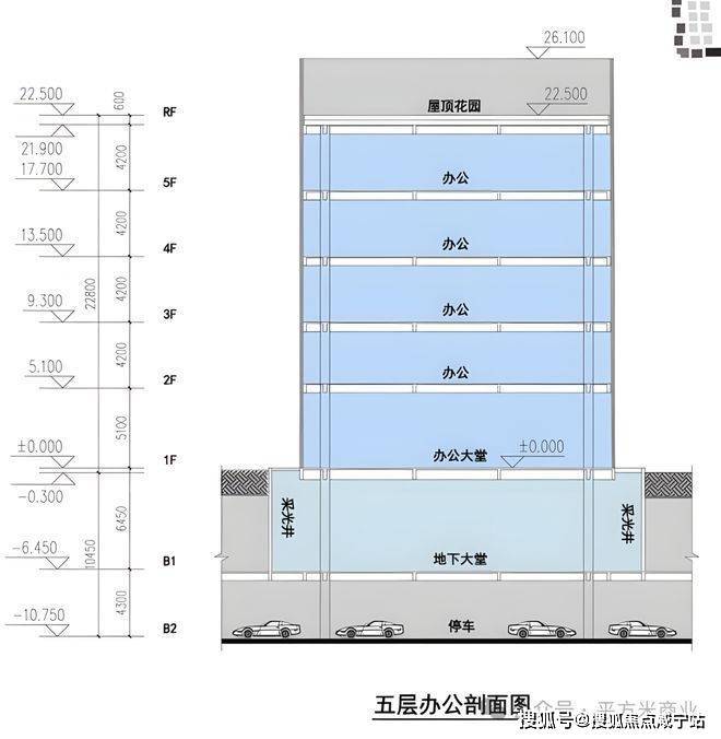 附赠:通燃气,屋顶花园、地下两层、局部架空层、采光井