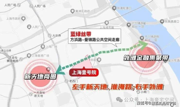 距离新天地直线距离约400米,作为蓝绿丝带规划上的关键节点,随着大新天地东进南拓战略逐步实施,通过水景、绿地和公共空间,串联新天地、豫园、外滩三大世界级商业版图。