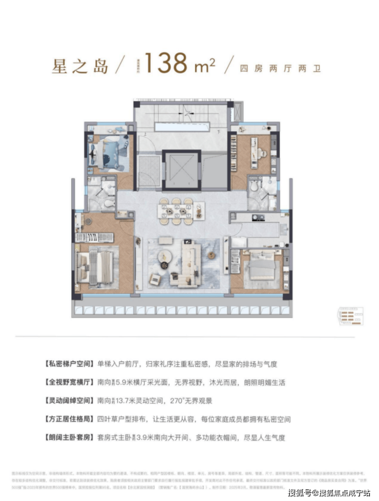 这个四房虽然建面只有138㎡,但因为是5层叠墅的高得房率,以及室内空间的高效利用,其功能和尺度感,给人的感觉十分惊艳。