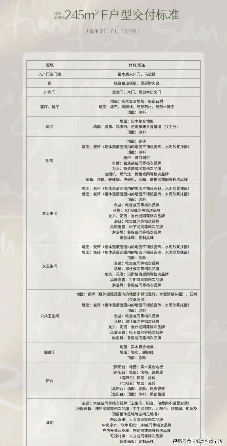 中海项目约245㎡户型:实木复合地板/瓷砖,局部石材、局部木饰、厨房嘉格纳(或同档次)五件套;