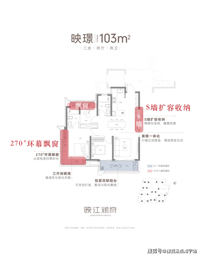 :三开间朝南+双飘窗全赠送,实得面积堪比95㎡竞品;创新S墙设计释放1.2㎡收纳空间,冰箱外置提升通透性。