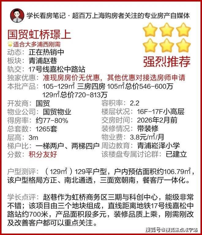 国贸虹桥璟上占据科创赵巷的高地,距离17号线嘉松中路站直线距离仅约700米,由国企国贸集团倾力打造,板块站位+地铁+国企品质+低总价上车,无论哪一点都是同价位段新房中十分能打的存在。