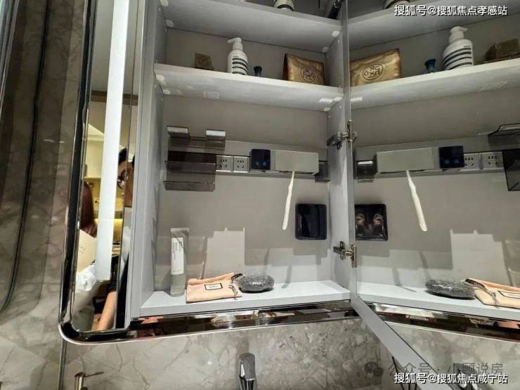 卫生间镜柜有个小小的亮点就是采用了镀铬镜柜边框,主卧镜柜有美妆冰箱,柜体也是通长的,收纳比较足。