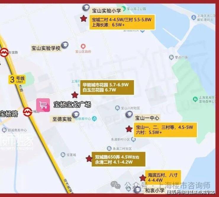 而靠近3号线宝杨宝龙广场的小区,由于定位相对比较高端,且距离地铁站近,又在至德实验附近,挂牌价最高已经到了6.9万/㎡。