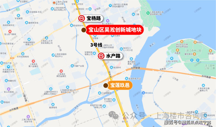 除了创新城的规划,地块本身所在的位置,也有一定优势。地块直线距离500米处有3号线宝杨路站,还有19号线,虽然直线距离约2km+,但是毕竟多一种出行选择。