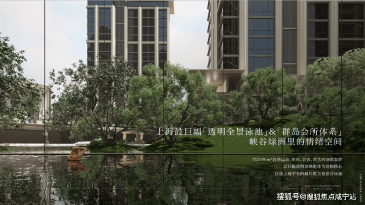 穿过园林,上海最大的约3500㎡下沉水院构成社区的核心灵魂,约13米的高差形成独特的“峡谷绿洲”,将黄浦江的水意象引入社区,中央平静水面与四周的会客舱、茶室、游泳馆形成呼应。