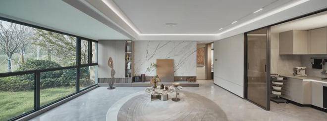 餐客厅踢脚线和厨房门框均为金属材质,开关面板全部定制同色系,把房屋美学做到极致……