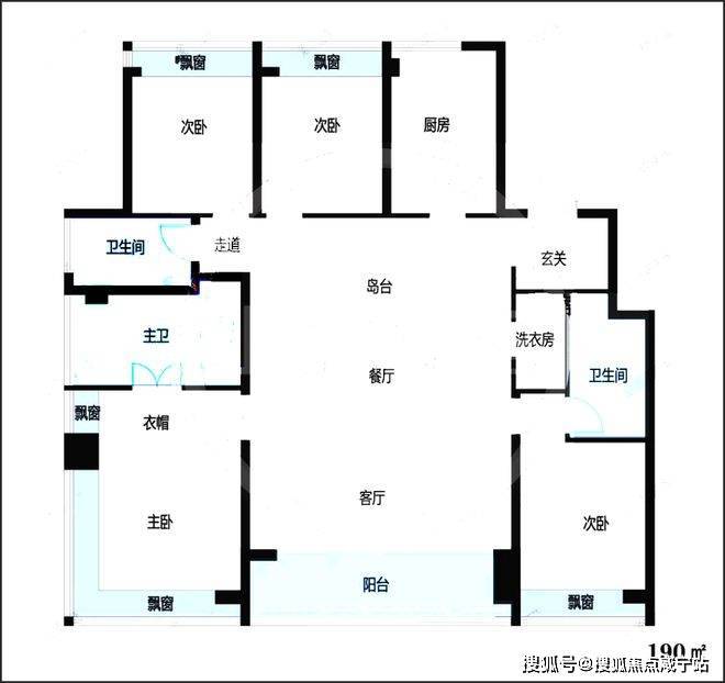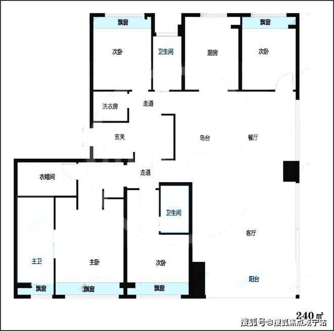 三个卧室朝南,书房位于北侧,主卧和书房都有大尺度转角飘窗。全屋的收纳不足。公卫采光对着公区的天井空间。