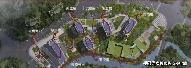 近7米垂直高差峡谷庭院,社区高约5-8.3米全架空层设计,形成高差约14米的全龄剧场。为打造悬空观景平台,不计时间与成本,放弃中轴线上一套本可销售的大户型,营造一个个通透的架空艺境,犹如散落在自然里的珠光宝盒。