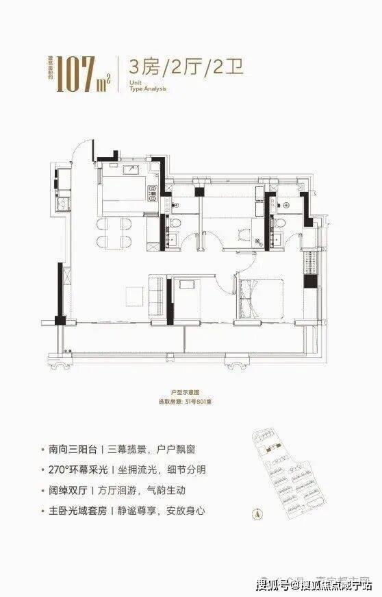 大华星屿建面约107㎡户型南向2个大阳台的合计建面接近16㎡,远超新规标准。如果再算上飘窗附赠以及电梯厅延伸空间,可使用率接近100%!(非得房率,最终房屋得房率以实测报告为准)同时建面约107㎡户型做到做到了约5米超大宽厅设计,3.5南向面宽+南北通透的格局让采光通风效果俱佳。主卧套房配置,朝南次卧面宽约3.2米外接阳台,朝北带大飘窗,做到了真正的大三房功能,每个空间的尺度都远超同面积段区域其他产品,妥妥的明星户型!