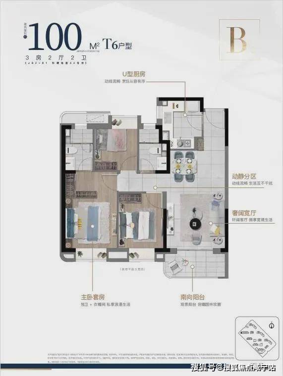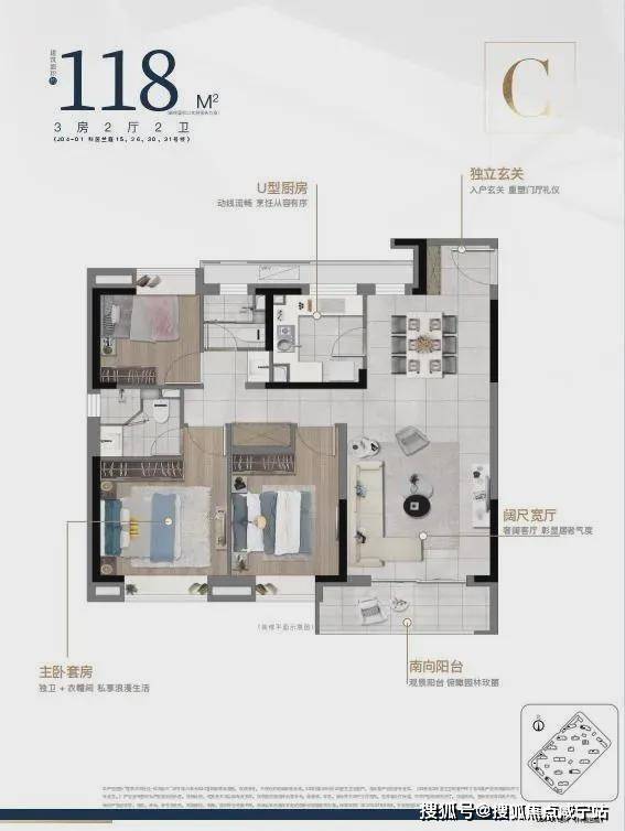 :6.8米景观阳台连接主卧,南向面宽13.2米;独立家政间+双套房设计,三代同堂互不干扰。