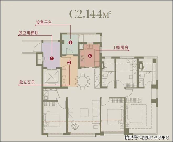 南向面宽达13.4m,四开间朝南,全卧超南。实得率超95%,多了20平空间,三阳台,满飘窗,设备平台,主卧室270°套间设计。层高3.15米。这个户型对比样板房,储藏间更大了,玄关收纳空间更大,收纳空间更多