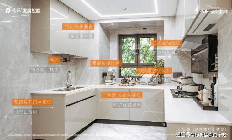 U型厨房带飘窗的设计,左侧预留了双开门冰箱位置,让整个空间的利用率更高。
