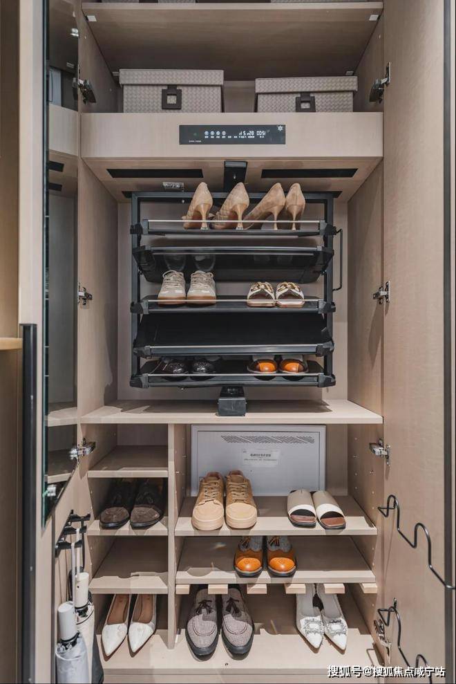 钢木复合入户门隔绝外界喧扰,品牌智能门锁多种方式便捷归家。美观实用的玄关柜内含旋转鞋架/消毒精灵等多功能设置,搭配精致金属壁龛,带来别具一格的空间观感。