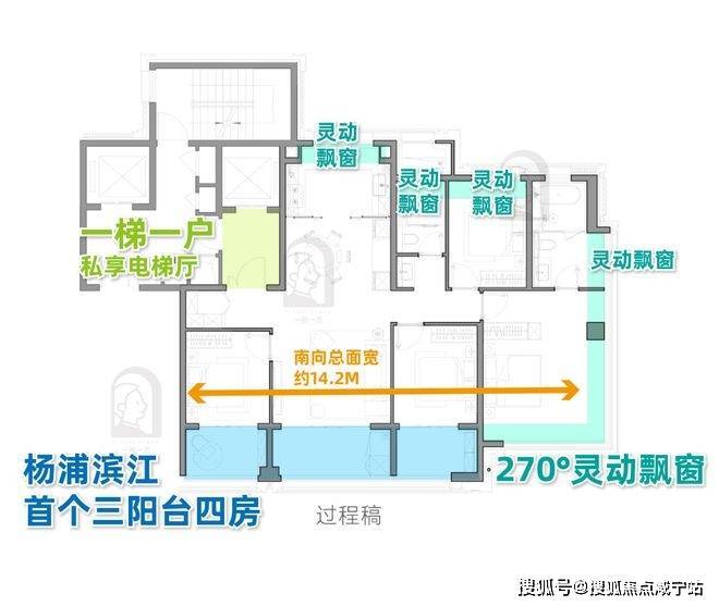 四面宽朝南布局,南向总面宽约达14.2米,搭配三阳台设计,最大化引光入室。