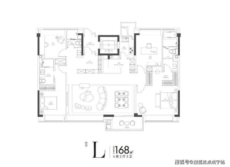 该户型做到了其它相近面积户型远远不可及的尺度感、通透性