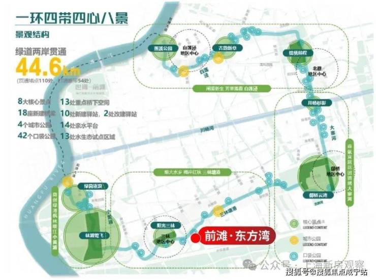 周边前滩友城公园、前滩体育公园、东明公园等已建成公园,三林塘港、“林浦莺飞”、“绿茵逐浪”等核心景点将连缀成片,形成气势磅礴的滨水公园带。