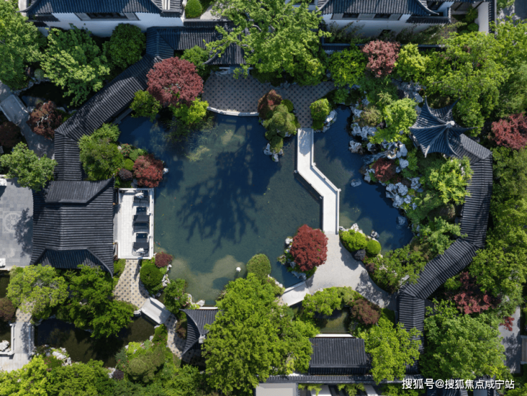 金瑞园以江南园林为范,遵循九经九纬规制,呈“围龙宝地”之势。坐北面南,布局五进制南北主轴与“双龙戏水”双水街,七大景观组团相互辉映。