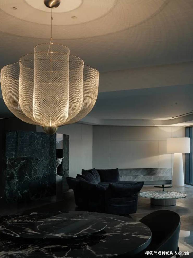 借以Moooi的枝形吊灯向整个开放区域投放出细腻的美感,即便是金属质地却丝毫没有硬朗的质感,光线通过铁丝网散射,营造出温馨而梦幻的氛围。