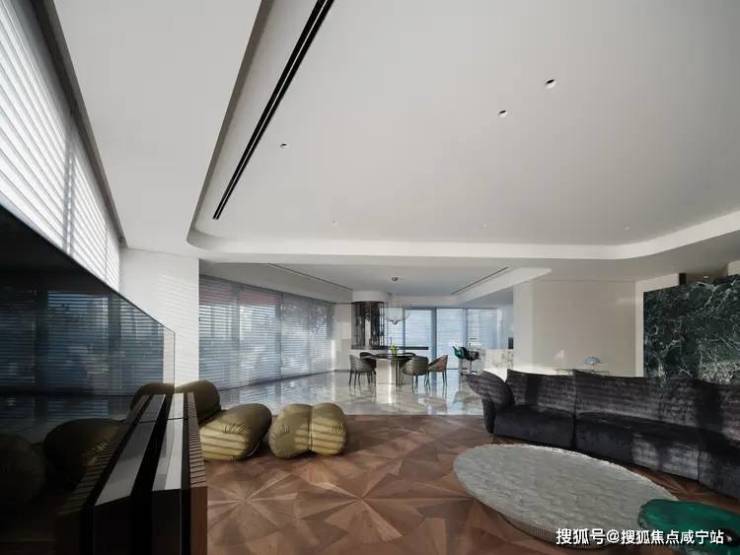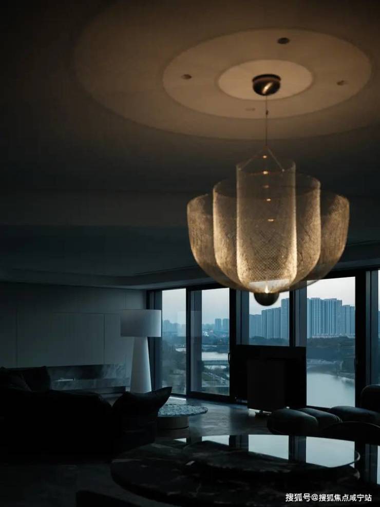 跳脱出固有的客厅设计,让超宽观景落地窗成为电视的天然背景墙,将城市景观置于落地窗内:白天是与秒流动的自然光线,夜晚则是一览无余的现代繁华。