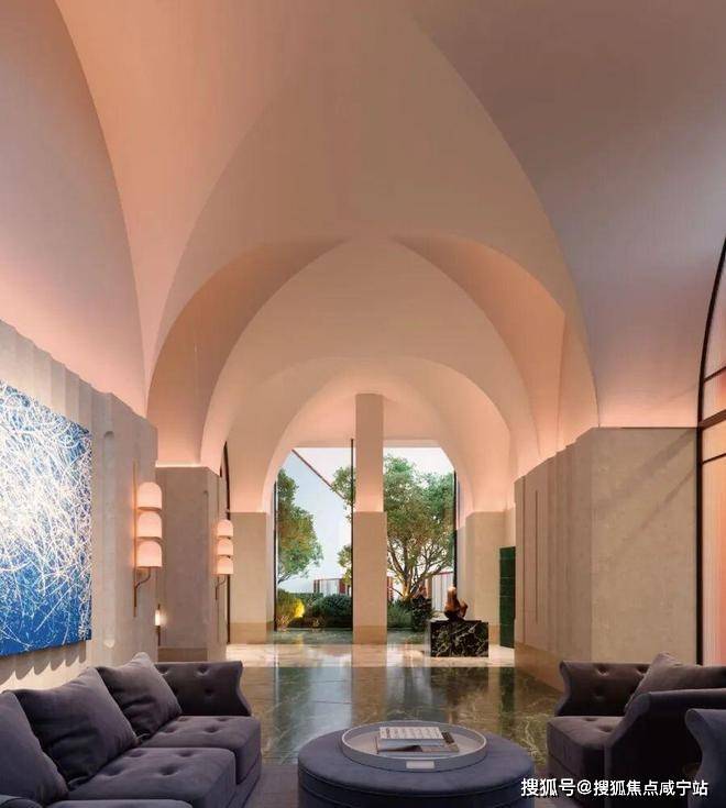 从九龙路起步,在繁花水岸的滨水步道上漫步归家;归家之路在滨水艺境另一侧,是约7000㎡的沉浸式邻里风貌街区,融合党群服务与邻里综合体业态,可在归家路途中感受精致烟火气;之后抵达九龙路归家主入口的河岸艺术大堂,两条地上细分动线,藏着不同的归家意趣:一条从主入口艺术大堂步入,沿着风雨连廊穿越花园小径,光影透过叶片洒落脚边,风携花香漫过肩头,仿佛逛完一场印象艺术展;另一条则经风雨连廊直抵“艺术品展列空间”泛会所,或许邂逅正在展出的私人藏品,在艺术氛围中完成圈层身份的过渡。最后步入电梯厅,半圆弧形天花吊顶暗合“天圆地方”东方哲学,让归家重拾恢弘而宁静的仪式感。