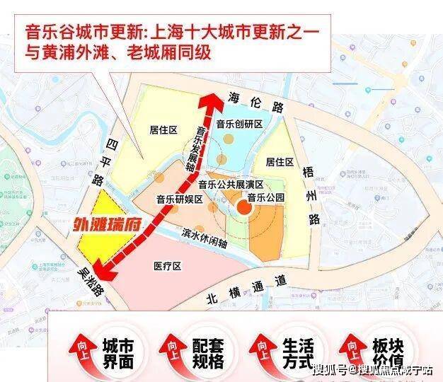 旁边还有上海首批十大城市更新单元——虹口嘉兴01单元。这个单元是内环少有的“完整水系风貌更新区”,未来将依托虹口港打造“一湾两半岛”,定位“东方百老汇”:滨水步行道连贯成片,百年石库门里弄变身爵士乐演出场地与独立艺术画廊,滨水市集的霓虹与水岸光影交织,形成“生活为体,音乐为魂”的海派艺文场景。这种“历史+生态+艺文”的高级烟火气,是传统豪宅区没有的,住这儿不是“看风景”,而是把生活过成“未来艺术化剧场”。