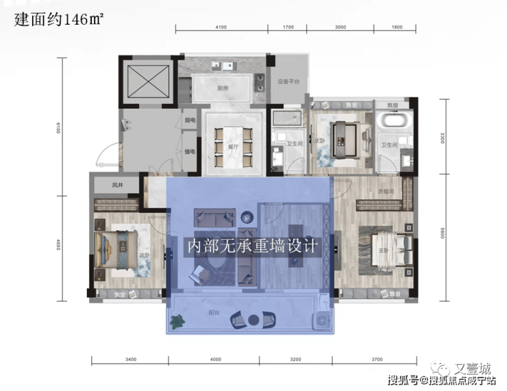 辅以独立玄关、北置的设备平台、270°采光宽幕阳台……整体户型的居住舒适度拉满了。