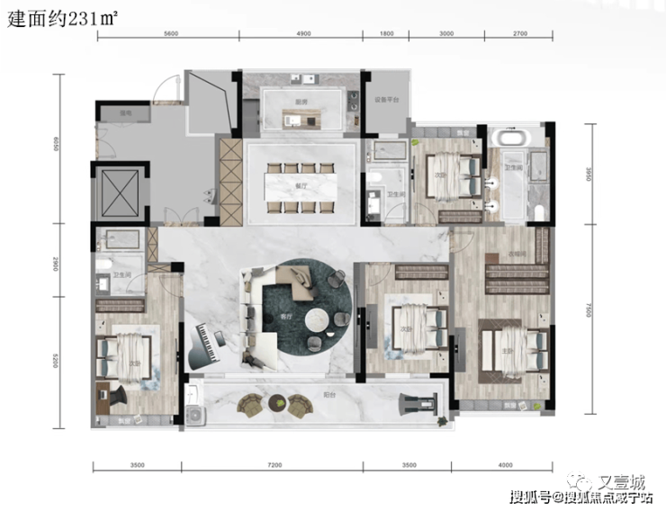 云境园最大建面约231㎡,几乎是建面约173㎡款的完整放大版。