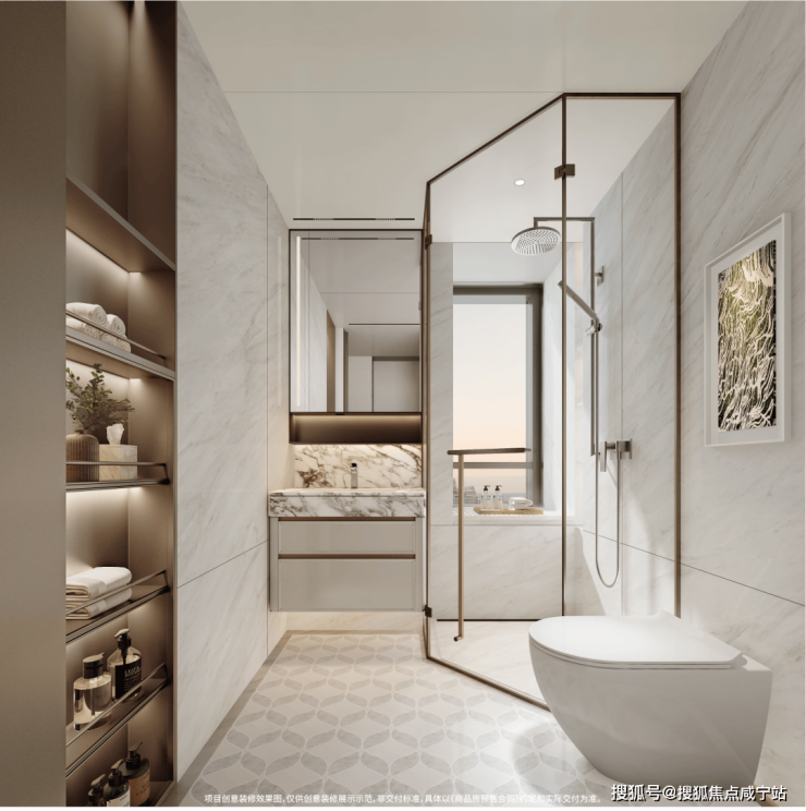 【卫浴系统】主卫恒温水阀搭配顶喷花洒,大理石防滑地砖与长条形地漏完美结合,公卫薄墙移门(不包括I户型)、淋浴区壁龛、一体式新风组合,主客卫双配智能马桶,静享高进阶卫浴系统时光。