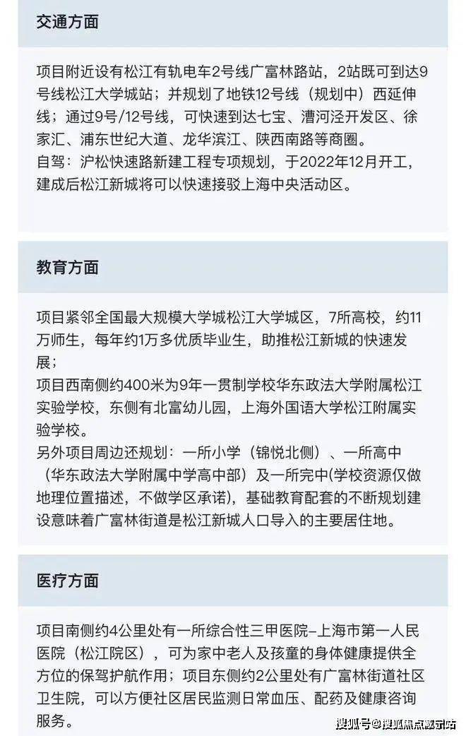 教育方面:项目紧邻全国最大规模大学城松江大学城区,7所高校,约11万师生,每年约1万多优质毕业生,助推松江新城的快速发展;项目西南侧约400米为9年一贯制学校华东政法大学附属松江实验学校,东侧有北富幼儿园,上海外国语大学松江附属实验学校、上海实验学校松江分校。