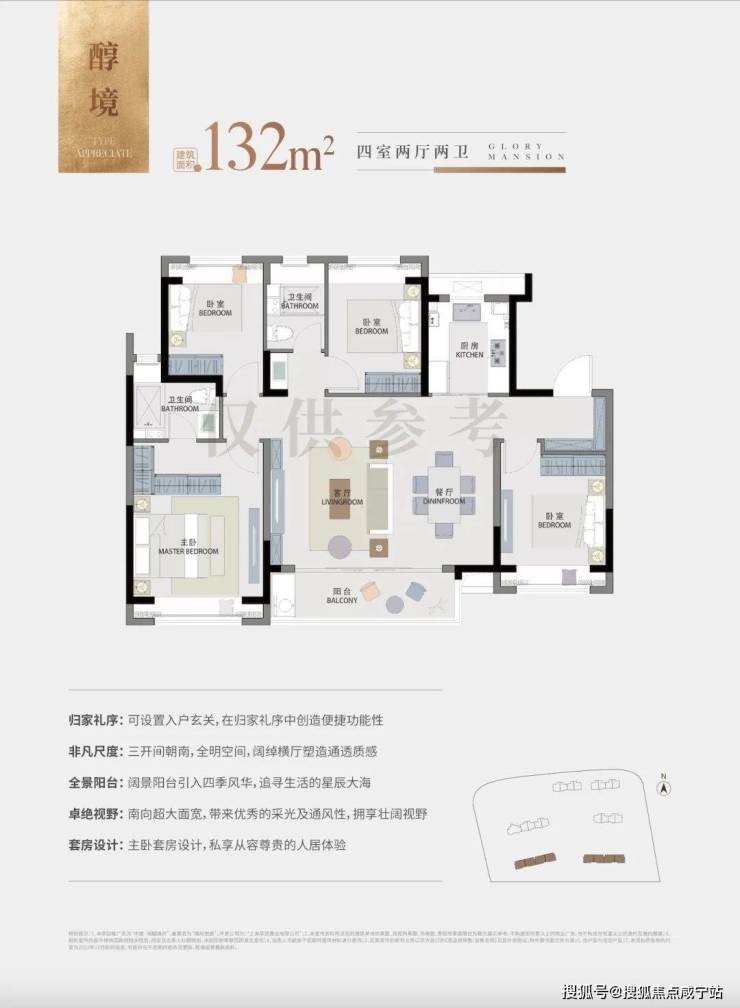 约132㎡四室两厅两卫户型,阔绰横厅设计塑造通透质感,南向超大面宽,带来优秀的采光及通风性,拥揽南侧河道自然景观,视野非凡。
