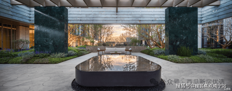 庭院中遍布着睡莲,从这里往出去像一幅画,高低层次的叠水景观,超大型的原石,还有私密的谈话空间,舒适惬意。