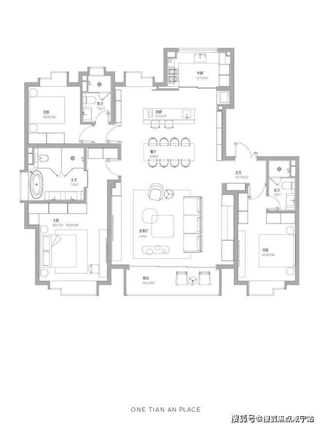 厨房、餐厅、客厅及阳台一体化设计,尺度感十足!
