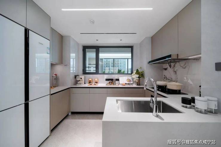 同时也释放了厨房空间,在U型厨房+水池岛台的组合,还能放下双开门冰箱。