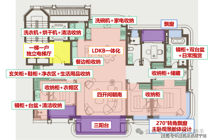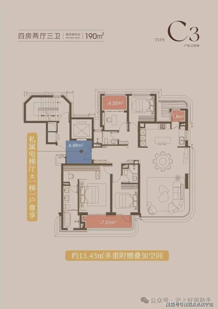 作为楼王中的顶豪户型,该户型有诸多亮点: