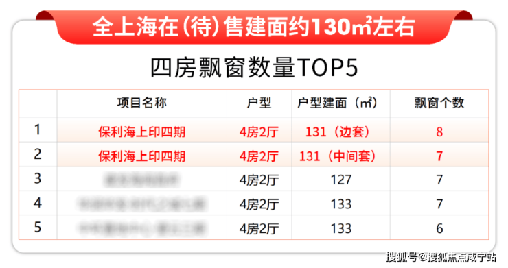 其中保利海上印四期待加推的建面约131㎡四开间朝南4房户型全部上榜,位列第五第六。