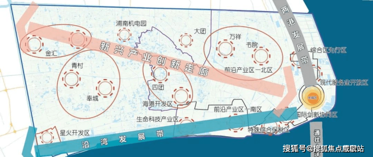 北向两港发展带从105现代服务业开放区至浦东枢纽, 发展刚刚起步; 西北向新兴产业走廊从万祥到奉贤四团青村金汇, 还未实质性启动。
