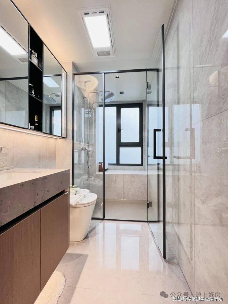 在细节上同样不遗余力。比如入户后的玄关柜是交付标准,打开厨房柜体、镜柜等各类收纳空间时均有惊喜;再如客厅和主卧均采用弧形吊顶,还有风暖浴霸、玄关顶面感应灯等细节,都透露出项目对品质生活的追求。