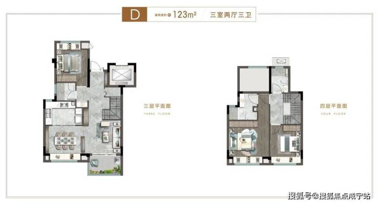 约123平上叠3房户型,共上下两层,全明设计,格局开阔,宽景阳台,上承天空,下承生活。