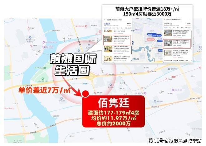 先看与前滩核心二手房的差距。前滩二手市场看似均价15-16万/㎡,但这基本是小户型的水平;真正稀缺的大户型,成长性早已拉开差距,普遍站到18万+/㎡。像晶耀名邸150+㎡4房,挂牌价超19万/㎡,总价直逼3000万;九宫格的三湘项目,挂牌价更是达19-25万/㎡的高位。