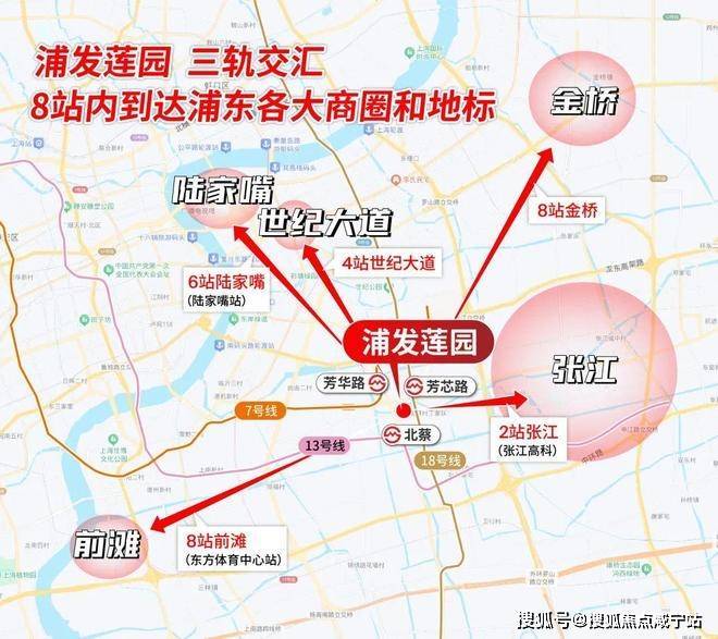 得益于7、13、18号线三轨交汇,从18号线芳芯路站出发2站张江、6站陆家嘴,8站内覆盖前滩、金桥。