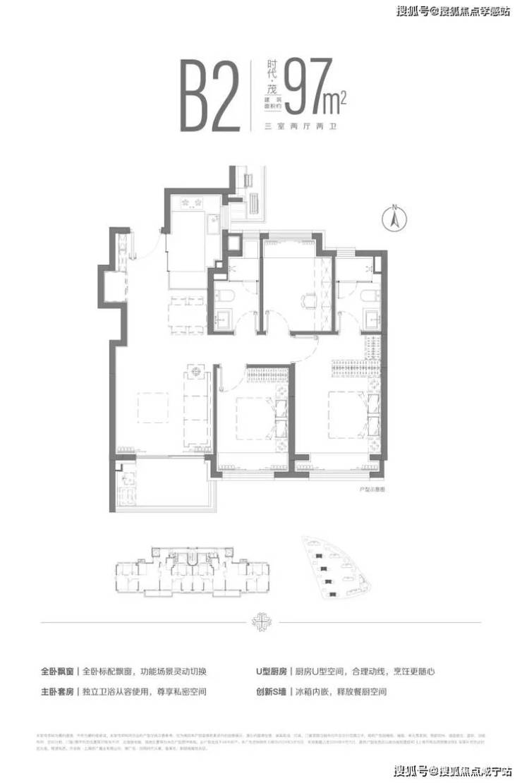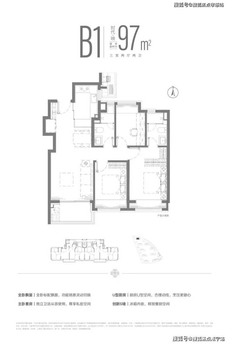 招商时代乐章售楼部电话:400-8800-703☎️☎️✅✅✅建面约97m²三房两厅两卫户型,全卧+主卫飘窗配置,并通过飞机户型空间布局,提升了空间的使用效率,让温情在自然中自然发生。